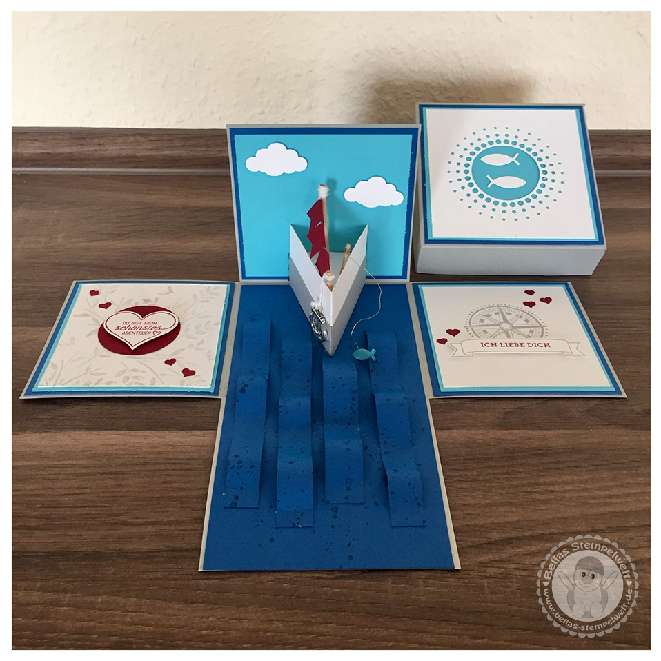 heute habe ich wieder eine Explosionsbox für euch. :o) Dieses Mal ist es etwas ganz neues geworden, das ich selbst noch nicht ausprobiert habe. Die Box mit dem kleinen Boot soll als Angelgutschein überreicht werden und da ich mal eine ähnliche Box bei "basteltantedoreen.wordpress.com" gesehen habe, habe ich mich daran etwas orientiert. :o)