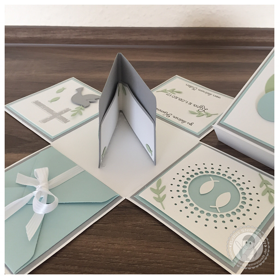 heute möchte ich euch mal wieder eine Explosionsbox zeigen. :o) Ich hatte den Auftrag für eine Firmung eine Box mit einer kleinen Verpackung in der Mitte für ein Geldgeschenk zu basteln. Inspiriert hat mich hierfür eine ähnliche Box im Dawanda-Shop von "Mamangela"! Farblich hab ich mich für ein schönes Dunkelblau in Kombination mit Türkis und Weiß entschieden. :o)