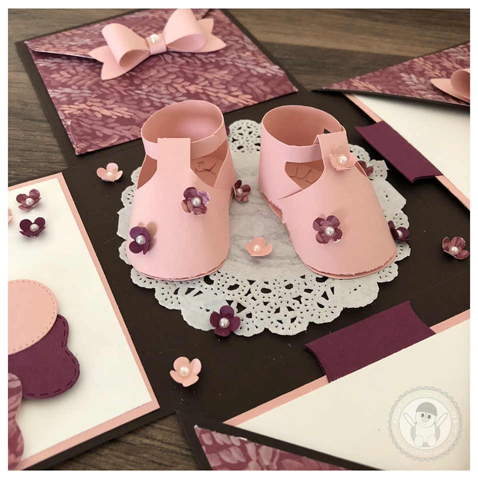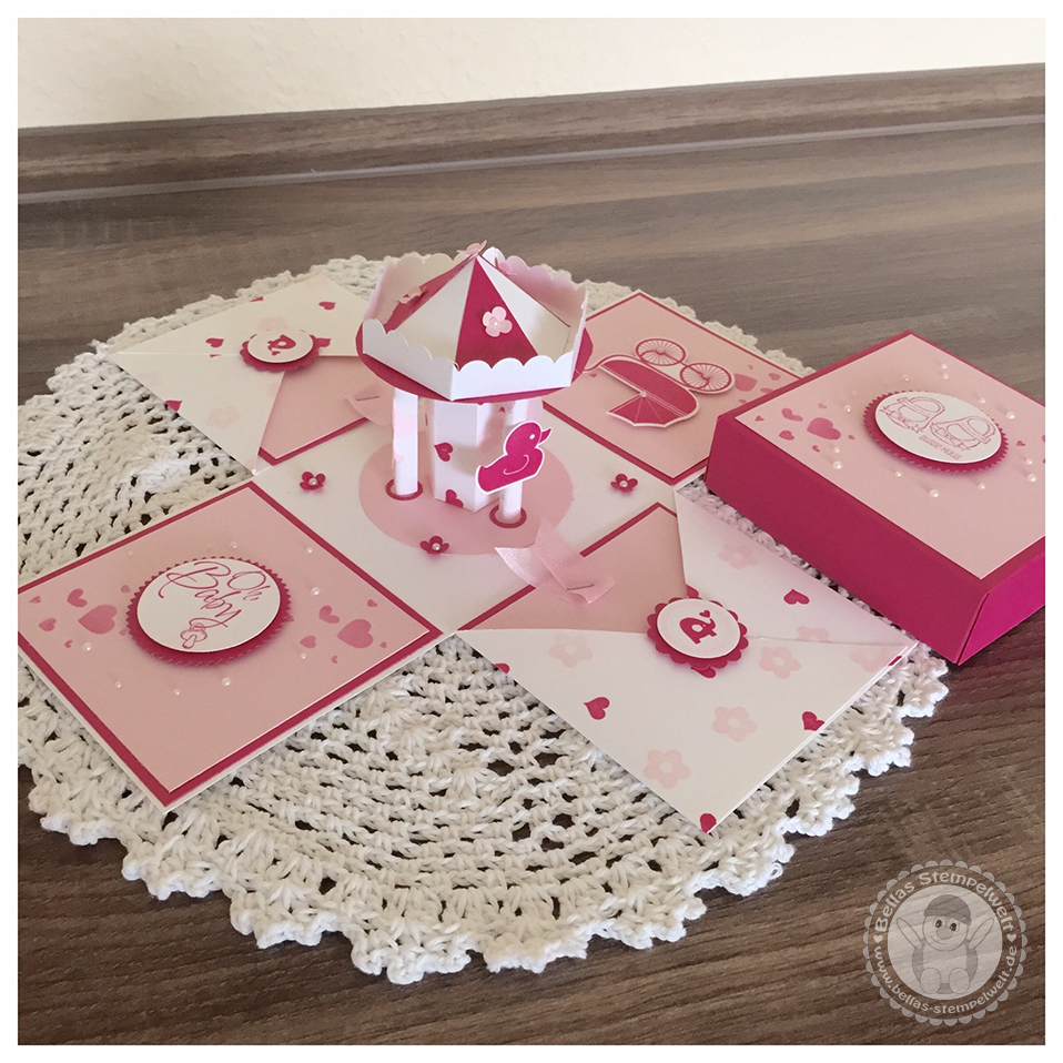 heute habe ich etwas Besonderes für euch, ich habe mich an eine Explosionsbox mit einem Karussell ran getraut und ich muss sagen, dass ich auf das Ergebnis doch etwas stolz bin. :o) Die Anleitung habe ich von wertschatz.wordpress.com. Als Farben habe ich Wassermelone, Zartrosa und Flüsterweiß verwendet. Für die Box habe ich einen 30 Zoll Bogen in Flüsterweiß mit Stempeln aus dem Set "Alles fürs Baby" in Wassermelone und Zartrosa bestempelt. Den Deckel der Box habe ich etwas schlichter gehalten, der Stempel mit den süßen Schühchen ist aus dem Set "Kleine ganz groß" und die Herzchen sind aus dem Set "Perpetual Birthday Calendar".