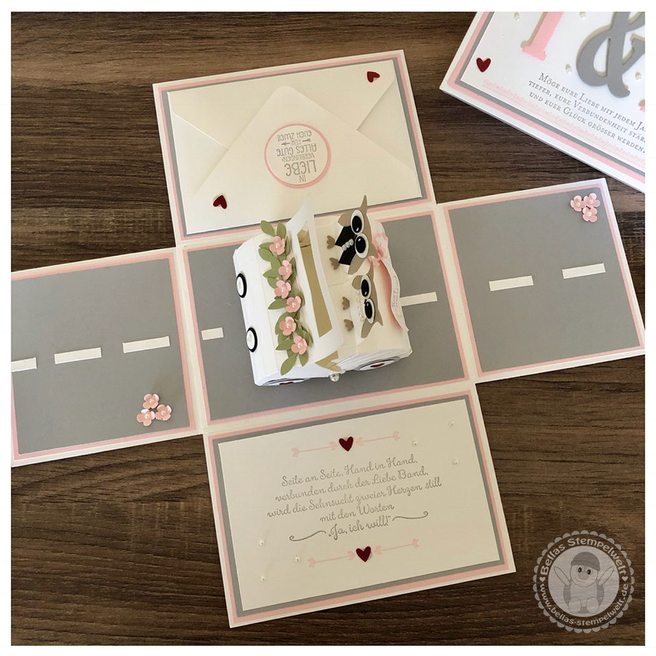 heute möchte ich euch meine neueste Explosionsbox zeigen, die ich mit einem süßen kleinen selbst gebastelten Auto und einem Eulen-Brautpaar geschmückt habe. Ich wollte sie schon sehr lange basteln, hab mich aber nie so wirklich ran getraut, deswegen war ich auch total überrascht, dass sie mir beim ersten Mal gleich so gut geglückt ist. :o) Farblich hab ich mich für Flüsterweiß, Kirschblüte und aus den ganz alten In Colors Pistazie entschieden.