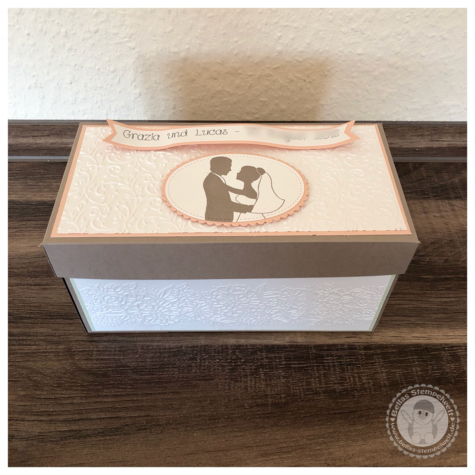 Auf eine Seite der Box habe ich einen Wunschtext aufgedruckt, auf die gegenüberliegende Seite ein kleines Fach für das Geldgeschenk und die anderen beiden Seiten passend zum Thema Hochzeit gestaltet. Der Deckel wurde an die Anfangsbuchstaben des Brautpaares angepasst und zusätzlich habe ich noch einen schönen Spruch aufgestempelt. Die Außenseiten habe ich zum Schluss noch mit einem tollen Blumenmuster geprägt. :o) Liebe Grüße, eure ![]() Hallo Ihr Lieben,