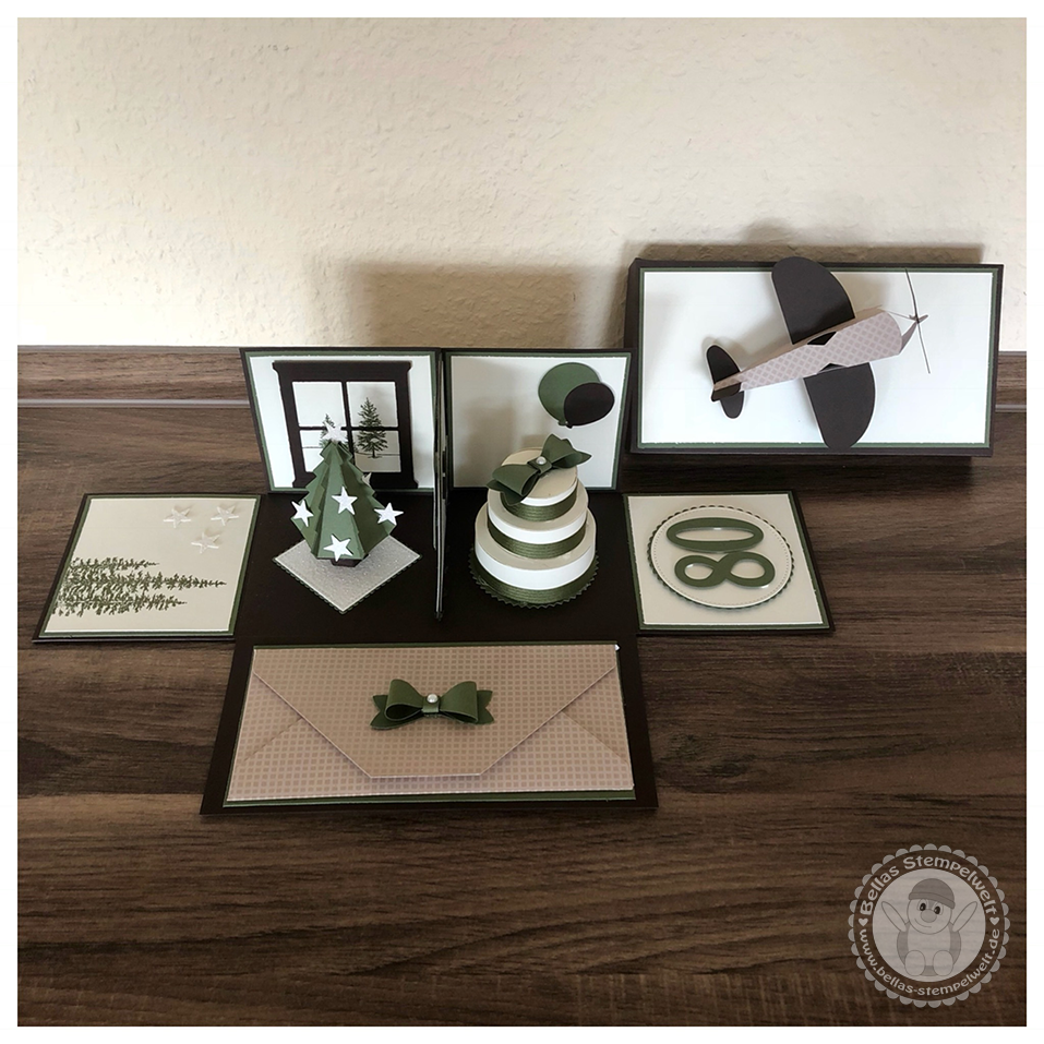 heute möchte ich euch eine Explosionsbox zeigen, die zum 70. Geburtstag für einen besonderen Restaurant-Besuch verschenkt wird. Da das Geburtstagskind männlich ist, habe ich mich eher für dunklere Farben entschieden und die Box etwas schlichter gehalten. :o)