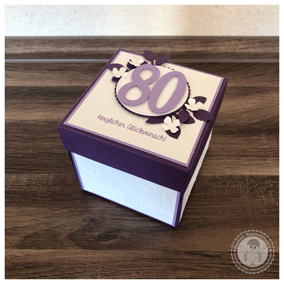 heute habe ich mal wieder eine Explosionsbox für euch. :o) Ich hab sie für eine ganz liebe Freundin gemacht, die sie zum 80. Geburtstag verschenken möchte.