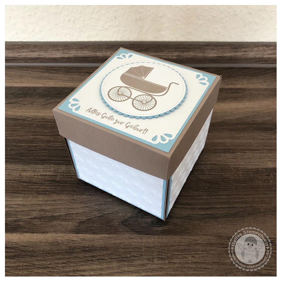 heute möchte ich euch diese süße Explosionsbox zeigen, in der sich ein kleines Kinderzimmer in Hellblau versteckt. Ich finde, dass sie ein tolles Geschenk zur Geburt ist, weil es etwas ganz besonderes und individuelles ist. :o) Gesehen habe ich sie so ähnlich bei Pinterest, nur leider war bei dem Foto kein Name oder eine Verlinkung dabei, die ich erwähnen könnte.