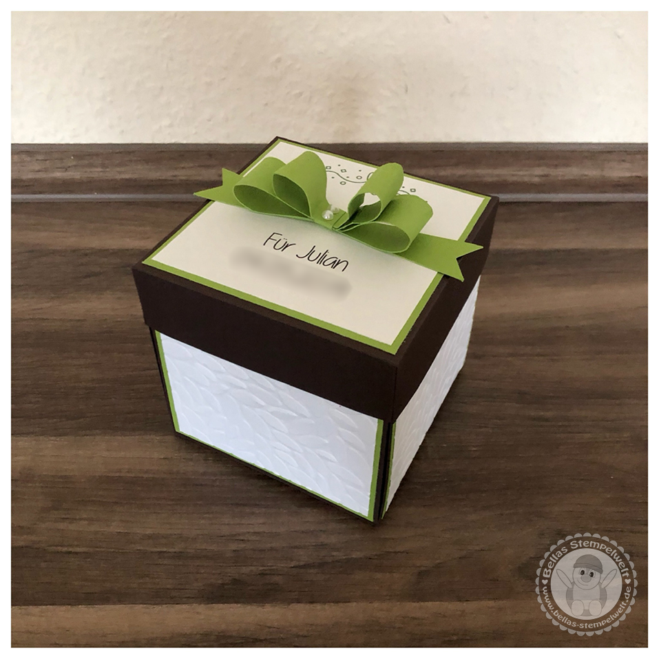 die Explosionsboxen haben es mir zurzeit angetan − ich hoffe, ich nerve euch damit nicht schon. :o) Aber meine nächsten Beiträge werden dann mit den neuen Produkten aus dem neuen Katalog sein, der ja endlich ab nächster Woche gültig ist! :o) Die aktuelle Explosionsbox sollte als Geldgeschenk für einen 50. Geburtstag dienen, da sie für einen Mann bestimmt war, habe ich die Farben, Flüsterweiß, Jade und Schokobraun verwendet.