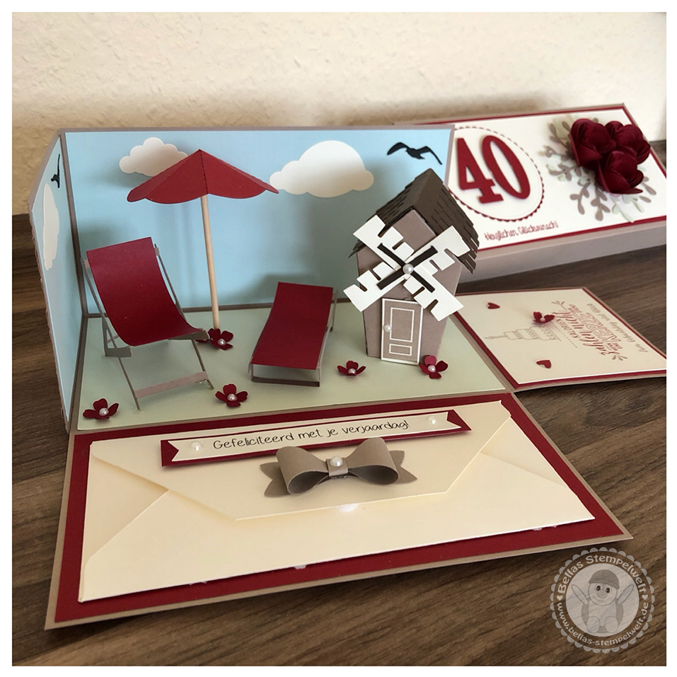 Da die Box zum 40. Geburtstag verschenkt wurde, habe ich die kleine liegende Seite, genauso wie den Deckel passen zu dem Thema gestaltet. Auf die größere liegende Seite habe ich ein großes Fach, oder Umschlag geklebt, um dort das Geld, bzw. den Gutschein schön zu verstecken zu können. Verziert habe ich die Box zum Schluss noch mit ganz viele kleinen Blumen und Perlen. Die gewünschte Farbkombi gefällt mir sehr gut, da ich Pastellfarben sowieso total gern mag. :o) Liebe Grüße, eure ![]() Hallo Ihr Lieben,