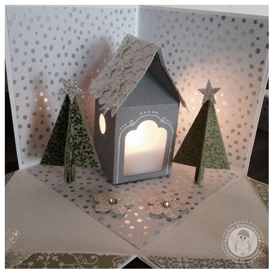 Die Box hab ich in den Farben Schokobraun und Vanille Pur gehalten. Irgendwie sind das dieses Jahr eine meiner Lieblings Kombinationen für den Advent. :o) In der Box ist ein wunderschönes kleines Häuschen, das ich mit der Mini Milchkarton Stanze erstellt habe, versteckt. Das Häuschen ist mit zwei Magneten an dem Boden befestigt, sodass man es sehr einfach hoch heben kann und darunter ein kleines LED Teelicht stellen kann. Das LED Teelicht ergibt wirklich einen tollen weihnachtlichen Effekt. :o)