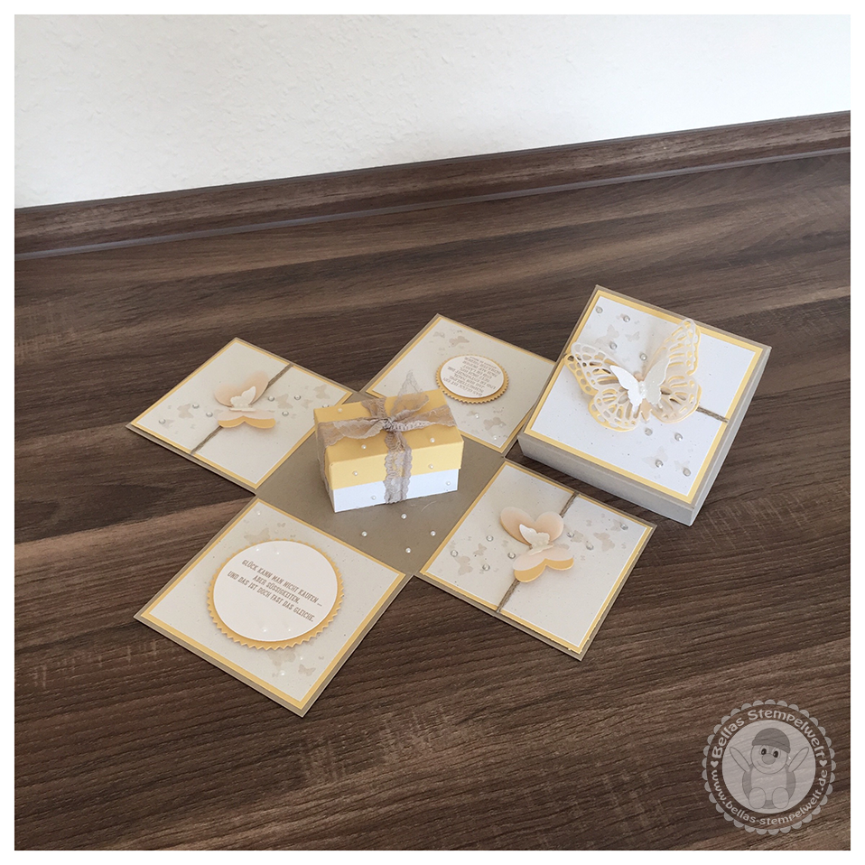vor ein paar Wochen habe ich euch diese Karte gezeigt *klick* Ich persönlich fand sie so schön sommerlich, dass ich mir eine passende Explosionsbox dazu ausgedacht habe. :o) Farblich habe ich sie genau gleich gestaltet, in den Farben Savanne, Cremeweiß und Safrangelb.