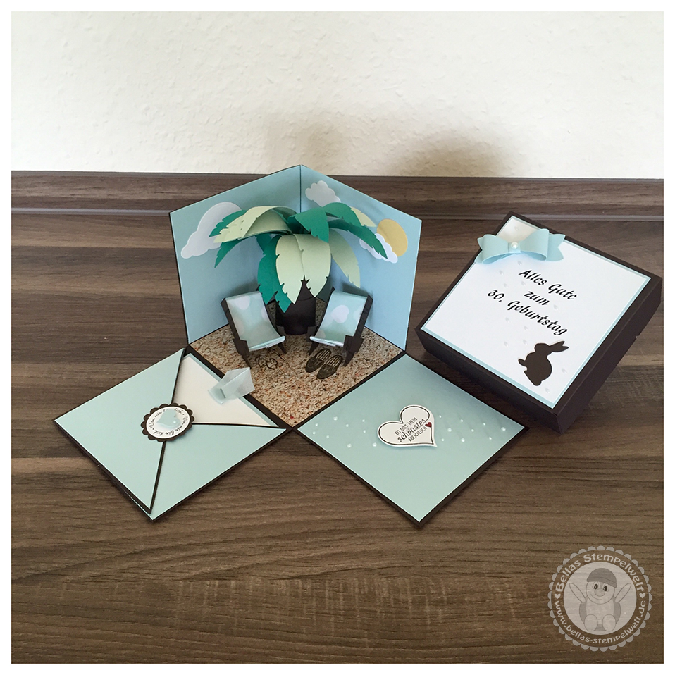 heute möchte ich euch wieder eine neue Explosionsbox zeigen. Dieses Mal sollte es eine Urlaubsbox mit einer Palme und Liegestühlen werden. Sie soll als " Überbringer" eines Reisegutscheins zu einem 30. Geburtstag dienen. :o)