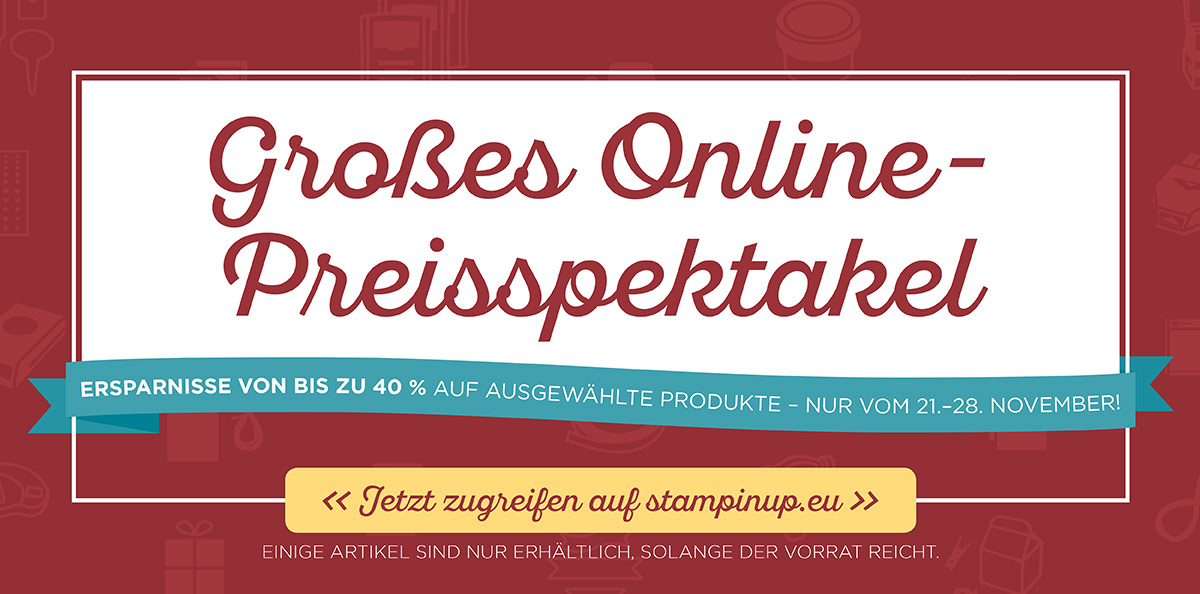 ab kommenden Montag (also übermorgen) gibt es bei Stampin` Up! für eine Woche ein großes Online-Preisspektakel mit Rabatten bis zu 40 %. :o)