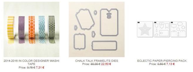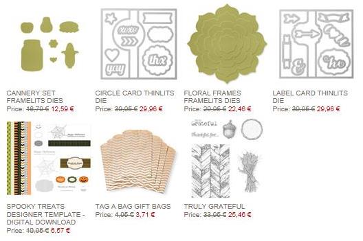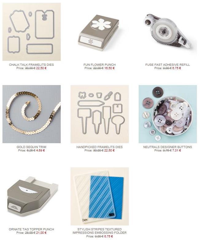 Auf der kleinen Übersicht seht ihr wieder, welche Produkte dieses Mal um 25% reduziert sind, es sind unter anderem die Konfetti-Stanze und auch ein paar schöne Bänder dabei. :o)